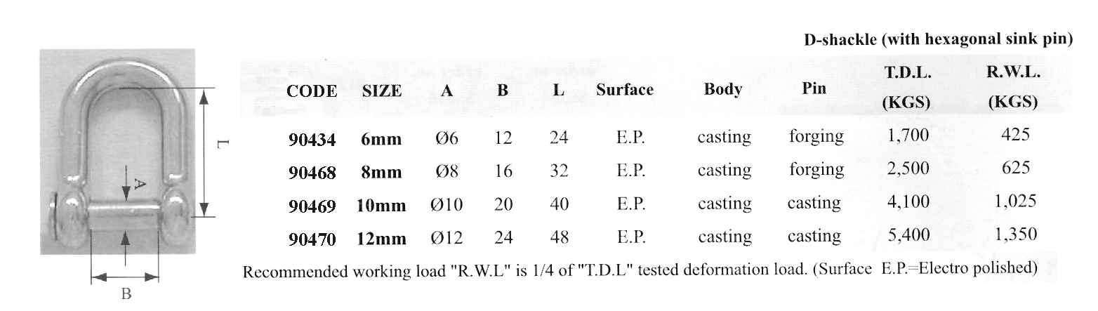 D shackle w/ inter. Hexagonal sink pin, AISI 316, Diam. 6mm